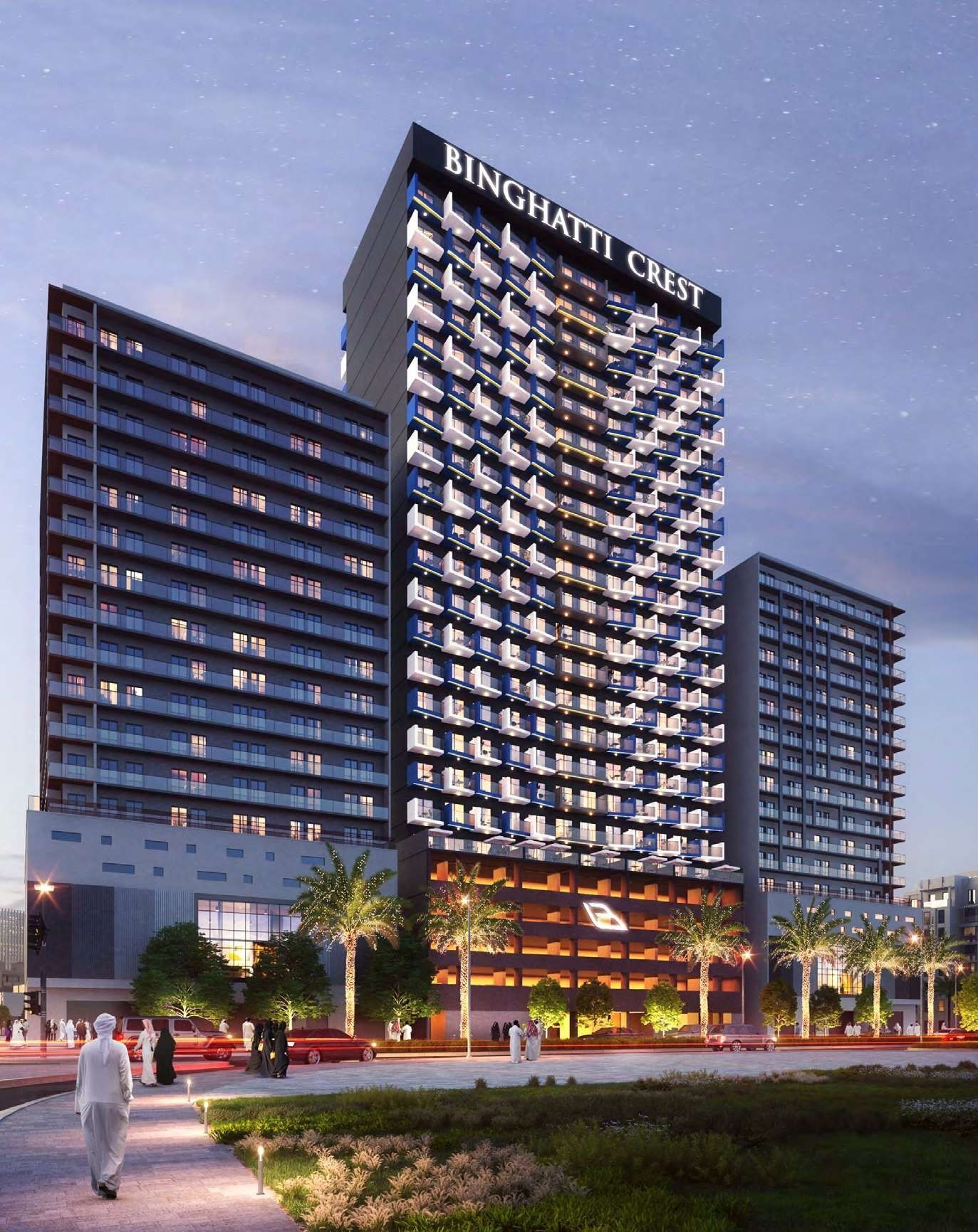 Binghatti Crest project features symbolic design cues, where individual balconies are interwoven together to form a unified community. This interesting pattern creates an illusion which makes the building’s static environment appear as a dynamic design. The building’s unique balcony design provides outdoors spaces for residents to enjoy, while also ensuring a sustainable design by providing shade which greatly reduces the amount of energy required to cool the living spaces of the building. The building showcases Binghatti Developers’ signature contemporary design style while also keeping traditional elements found in Middle Eastern art and architecture in consideration. The unique balcony design of the building offers residents an outdoor space to enjoy without compromising privacy. The building’s prime location ensures a great investment for its future owner