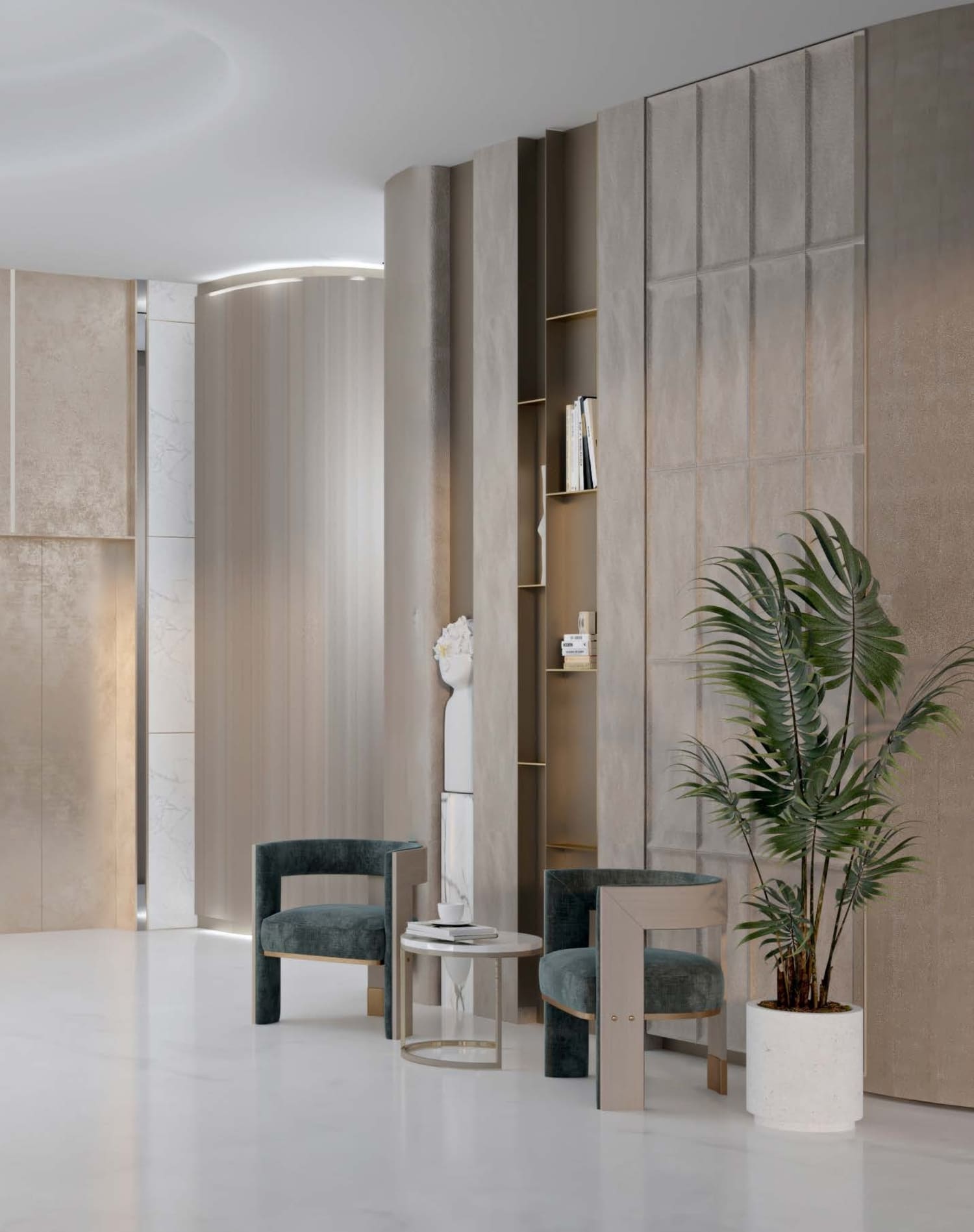 Gaya marble tan oak wood. Tinted black glass statuario marble. Brushed brass. Light grey honed concrete paint. Travertine marble. Stone beige.