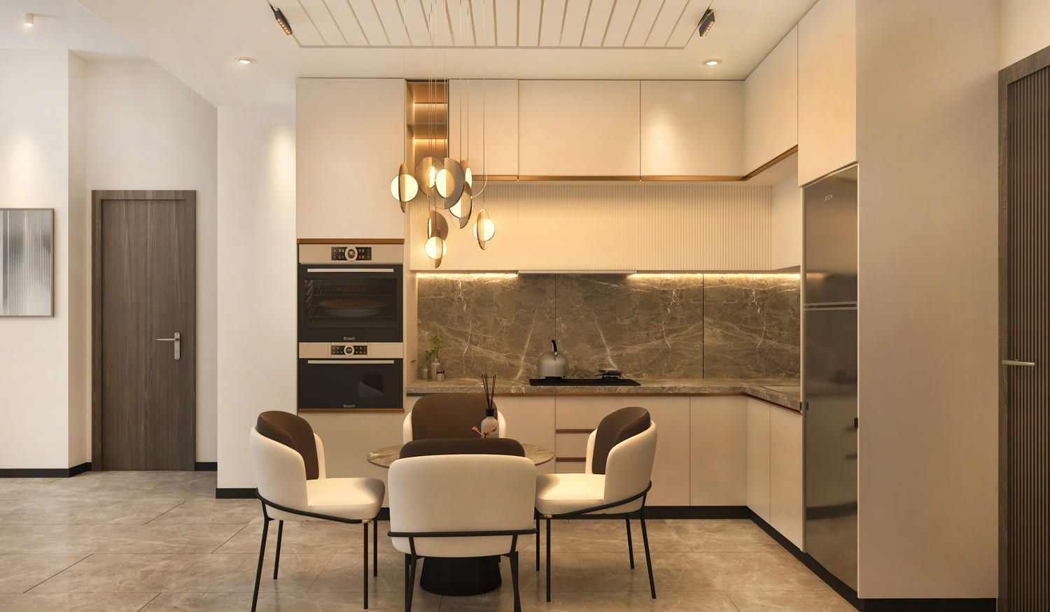Cosy designer kitchens & dining rooms offer a delightful composition of clement hues, with textured grey countertops and pristine white fittings.