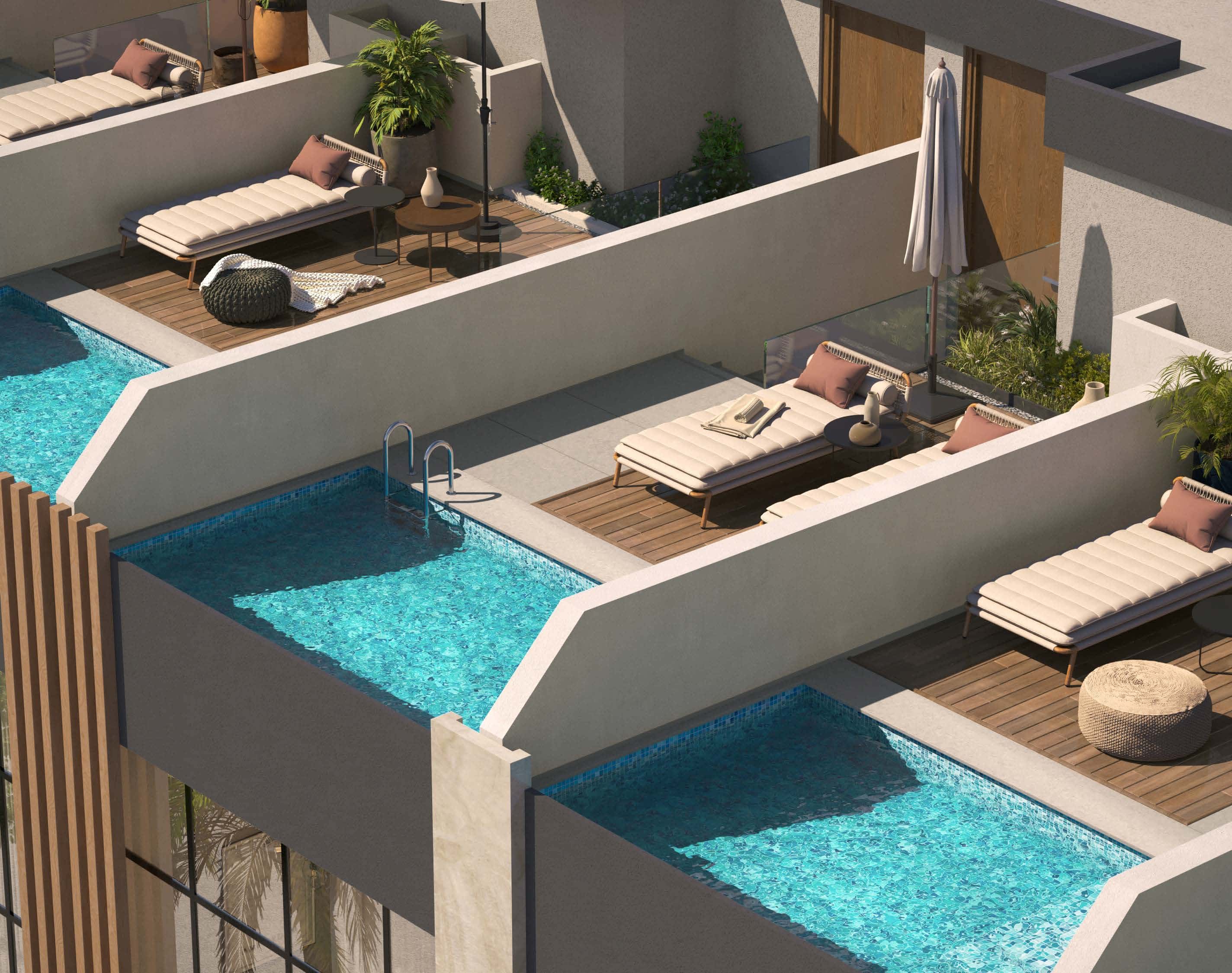 Additional features include private parking slots for each unit, private balconies or terraces, maid rooms in some townhouses, private swimming pools, and optional internal elevators, ensuring a comfortable and upscale living experience for all residents.