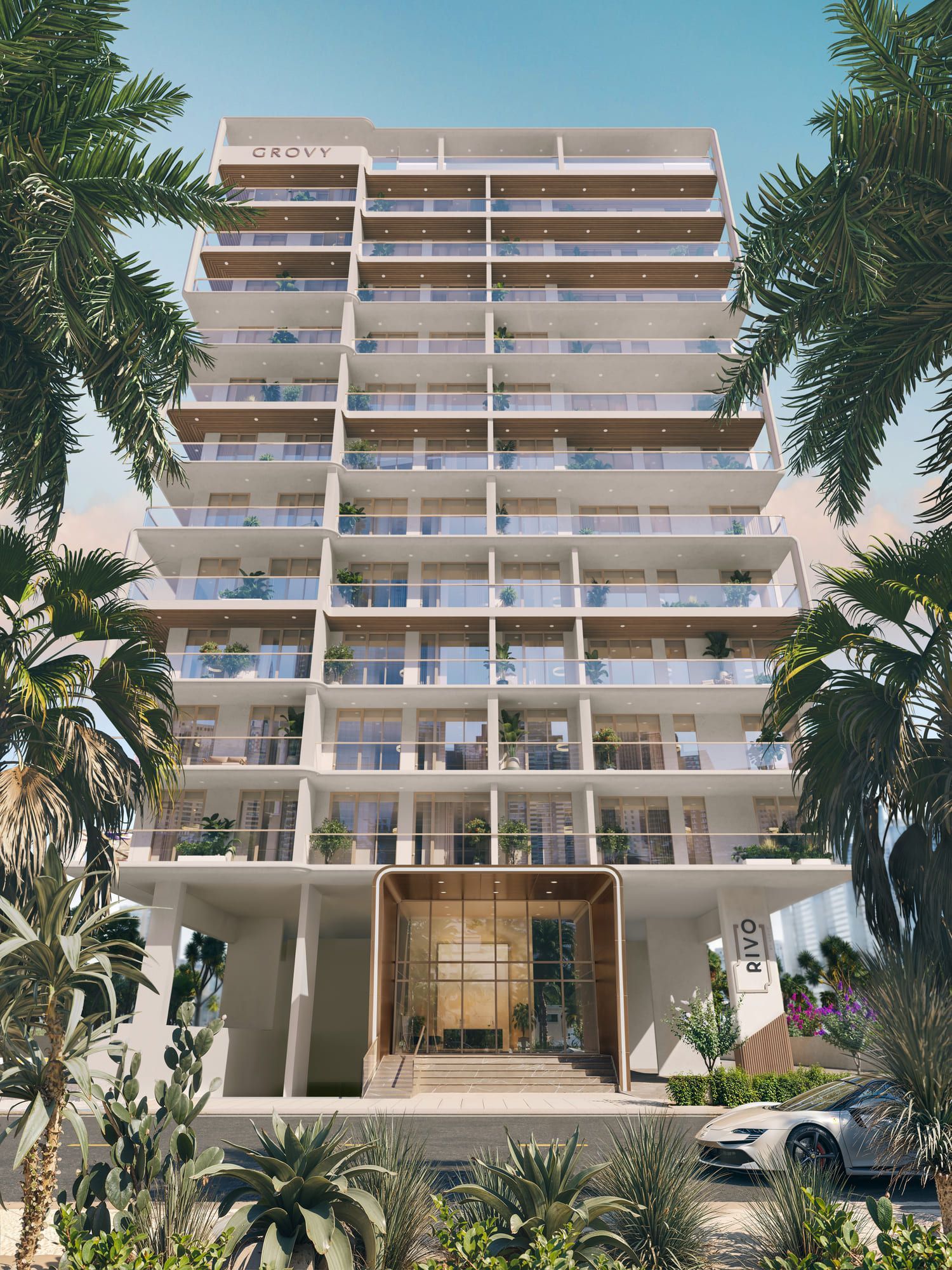 Rivo is envisioned as a living sculpture, where architecture flows with elegance and balance. Its design merges clean white contours, warm wood accents, and expansive glass facades, creating an impression of movement and calm. Each level appears to float above the next, with curves that soften the structure’s presence and invite natural light into every residence. The result is a building that embodies harmony and timeless sophistication.