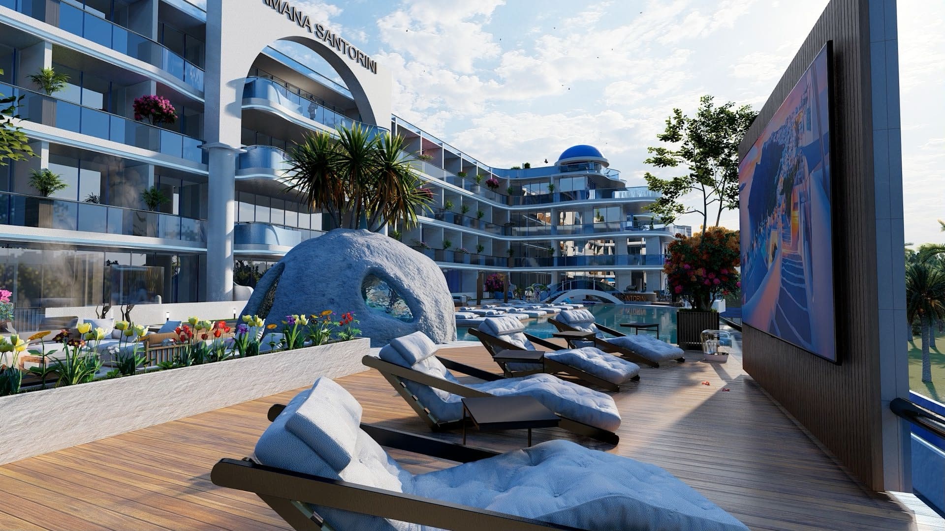 SAMANA SANTORINI by Samana Developers at Dubai Studio City is a project with the blue and white globally know Greec Santorini style. SAMANA SANTORINI features 157 luxury Studios, ONE, TWO and THREE-Bedroom apartments, some come with private pools and a world-class leisure deck featuring a myriad of resort like amenities.