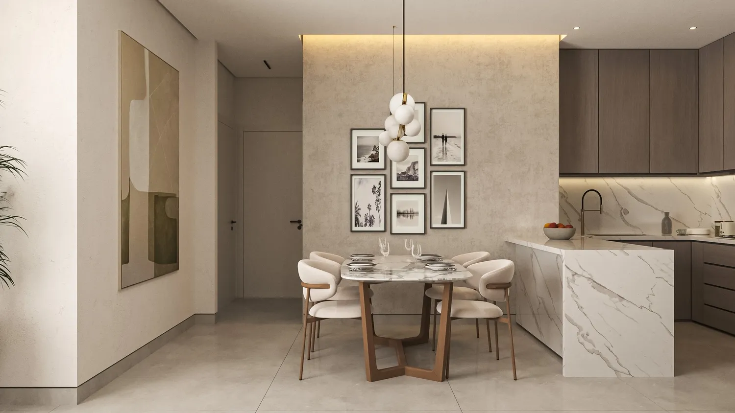 Interiors at AB Hills feature modern, high-quality finishes with a neutral, timeless palette. Materials include large-format floor tiles, textured wall finishes, and floor-to-ceiling windows that enhance natural light. Kitchens are equipped with built-in cabinetry, stone countertops, tiled backsplashes, and integrated kitchen appliances. The apartments are semi-furnished, with fixed joinery and kitchen appliances included, while allowing residents flexibility to personalize living and bedroom spaces.